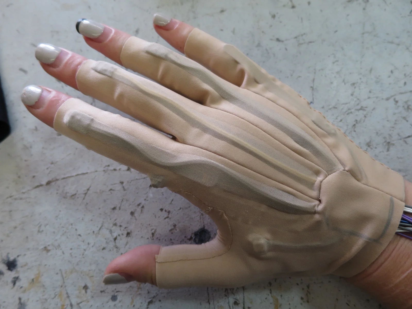 The V.3 design update removes the longer textile traces on the fingers, replacing them with wires to increase longevity while maintaining primary design features: softness and comfort. The hard/soft connection to the wired circuit [a soldered and stitched wire loop] moves from the back of the hand to the back of the fingertip, the extended wires now encased between two super-fine layers of fabric, and can be seen snaking along on the back of the fingers. Extra length is added for strain relief but the soft silicone wiring is imperceptible to the wearer.
